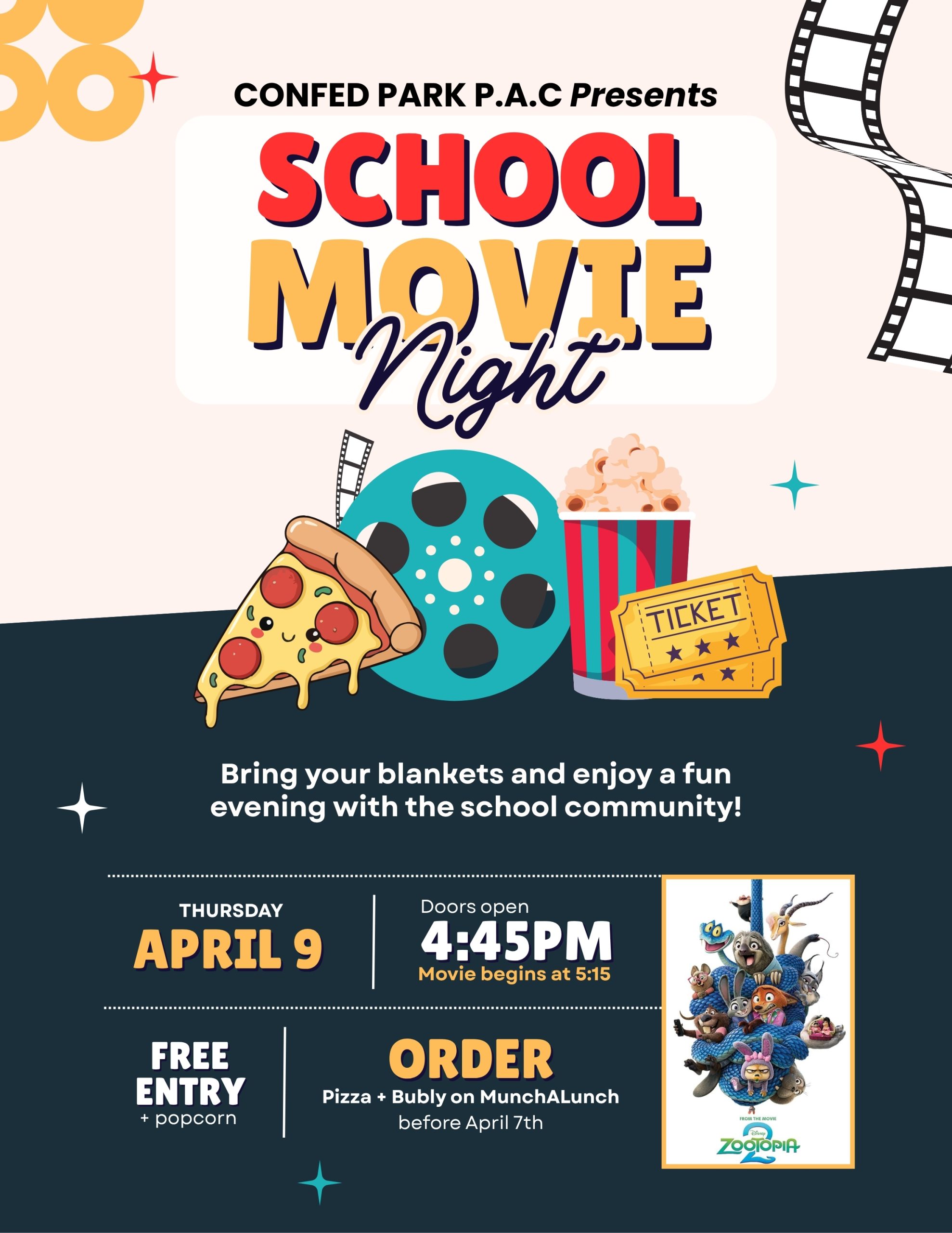 Bring the family all together for a fun school community night of pizza, popcorn and the hit movie “Zootopia 2″ on Thursday April 9th, 2026.
